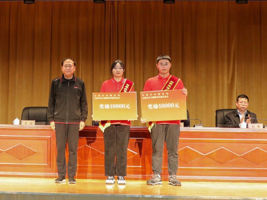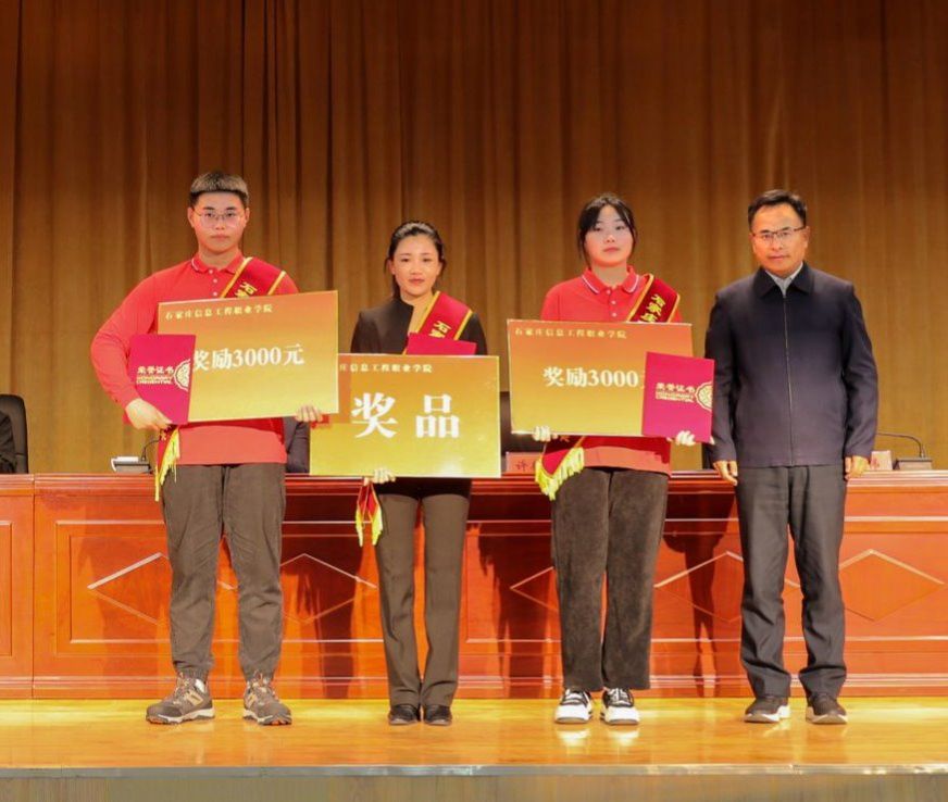 院长许征程,石家庄市教育局二级调研员、石家庄市立德教育发展基金会理事马力,副院长赵伟分别为“信工好青年”“育人楷模”颁发荣誉证书、奖金和奖品。领导班子成员为王浩然、王宁两名同学的家长赠送鲜花,感谢家长的辛勤栽培和默默付出。