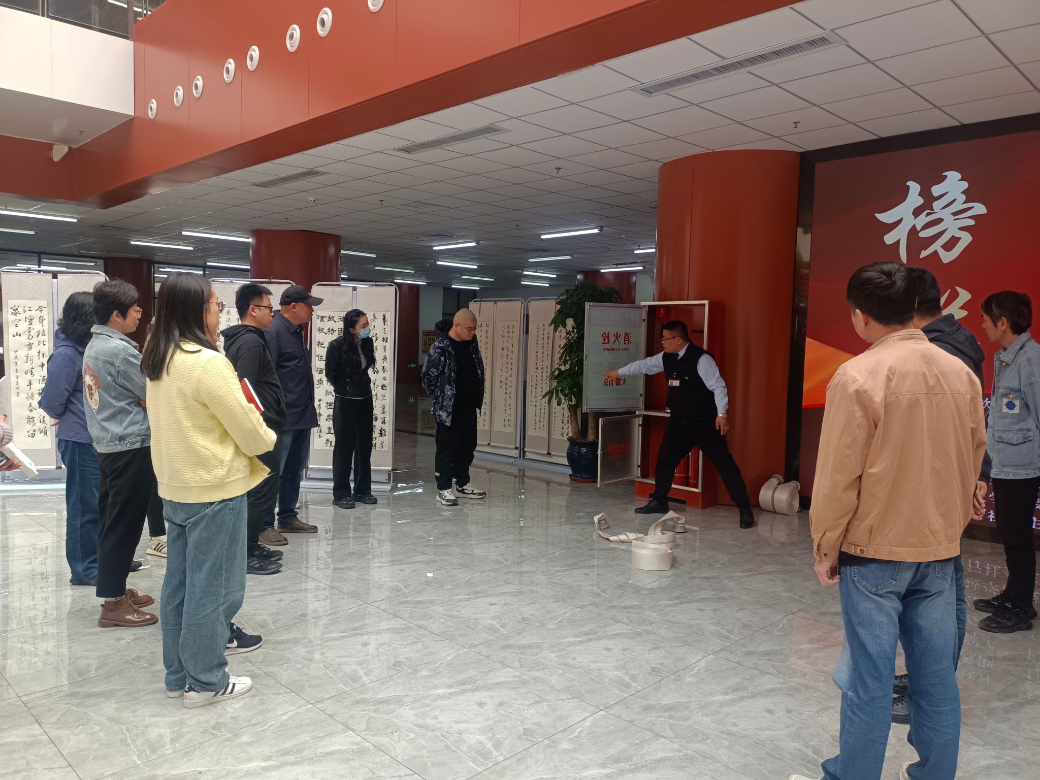 在图书馆二楼大厅现场教馆员们如何使用消防水枪进行灭火。
