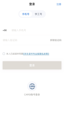 首次访问的读者需要连接校园网WiFi进入京东读书专业版平台,点击注册--选择本人所在学校--连接【校园网WiFi完成身份认证,根据页面提示输入手机号、姓名等信息完成注册
