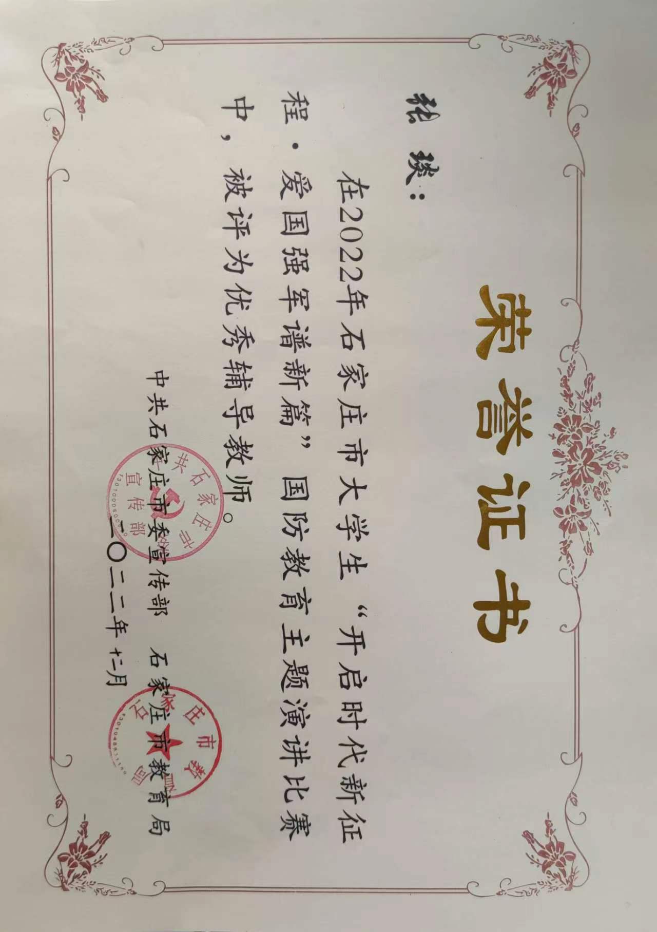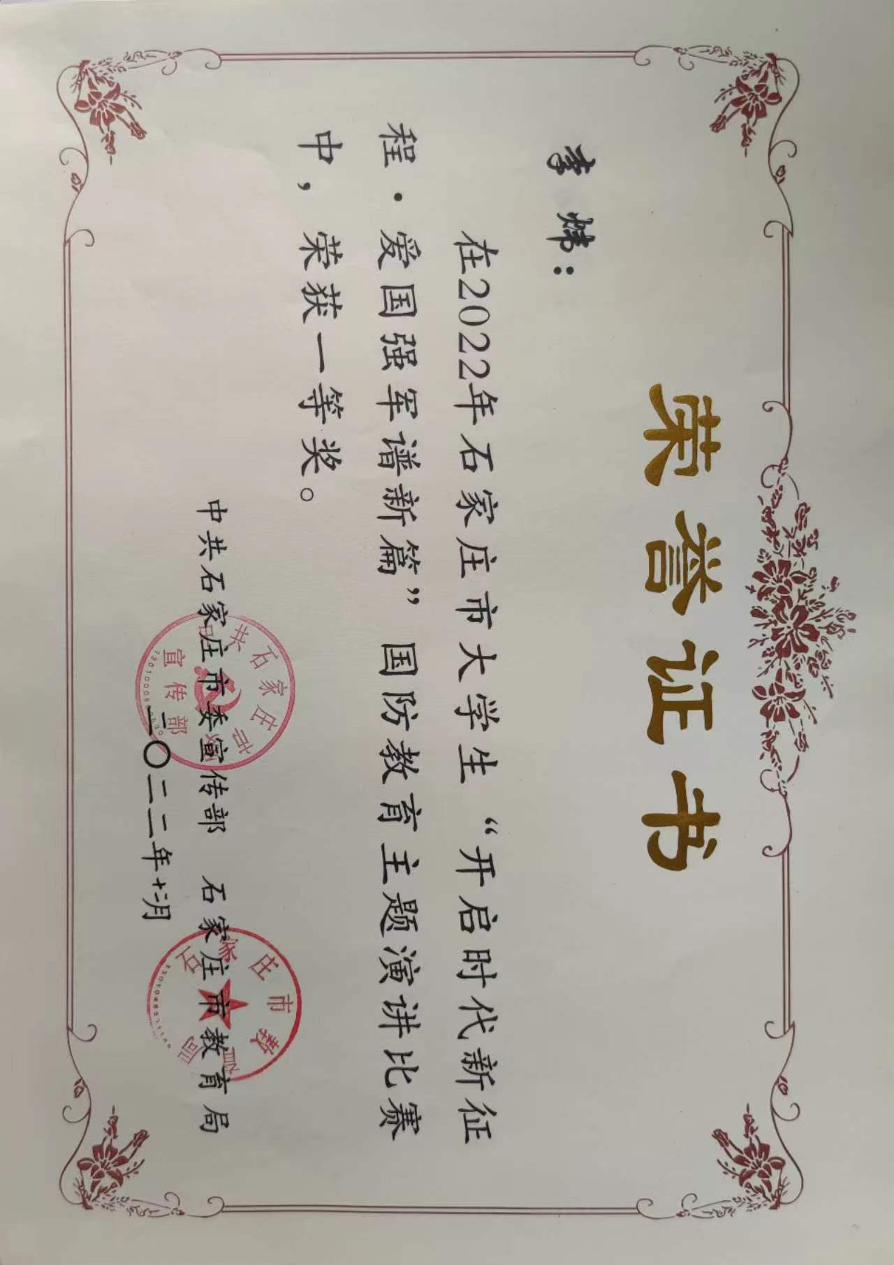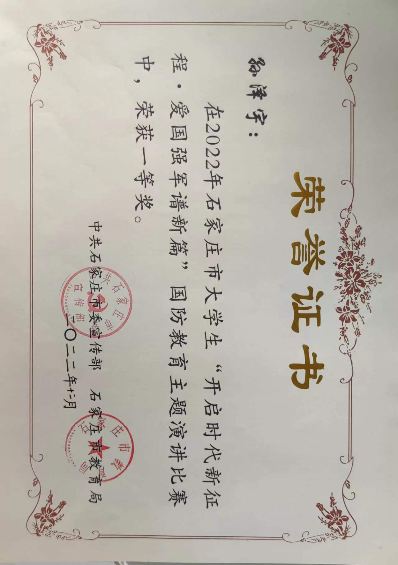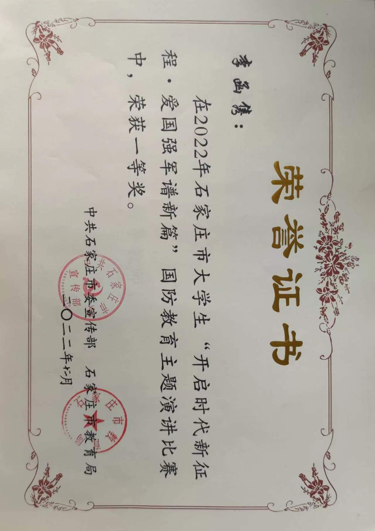 2022年10月,石家庄市委宣传部、石家庄市委教育局在全市高校范围内开展了“复兴强国有我”2022年石家庄市大学生“开启时代新征程·爱国强军谱新篇”国防教育主题演讲比赛,我院团委经过层层筛选,组织了四名学生参赛,最终参赛的四名同学全部荣获一等奖,张琰老师荣获“优秀辅导教师”。